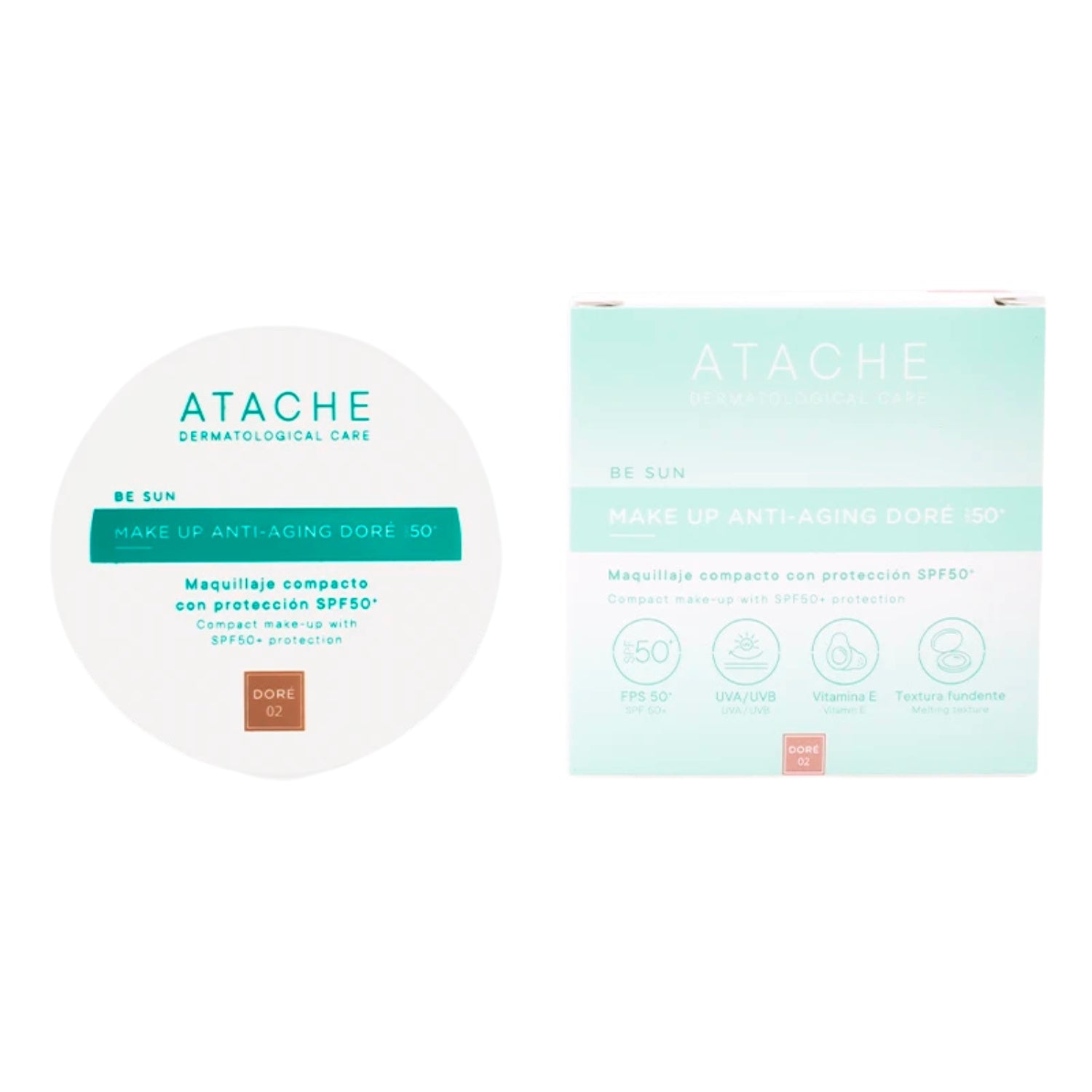 Maquillaje compacto SPF 50+, Atache Make Up Anti-Aging, protección solar con color, tono dorado, cuidado antiedad, maquillaje resistente al agua.
