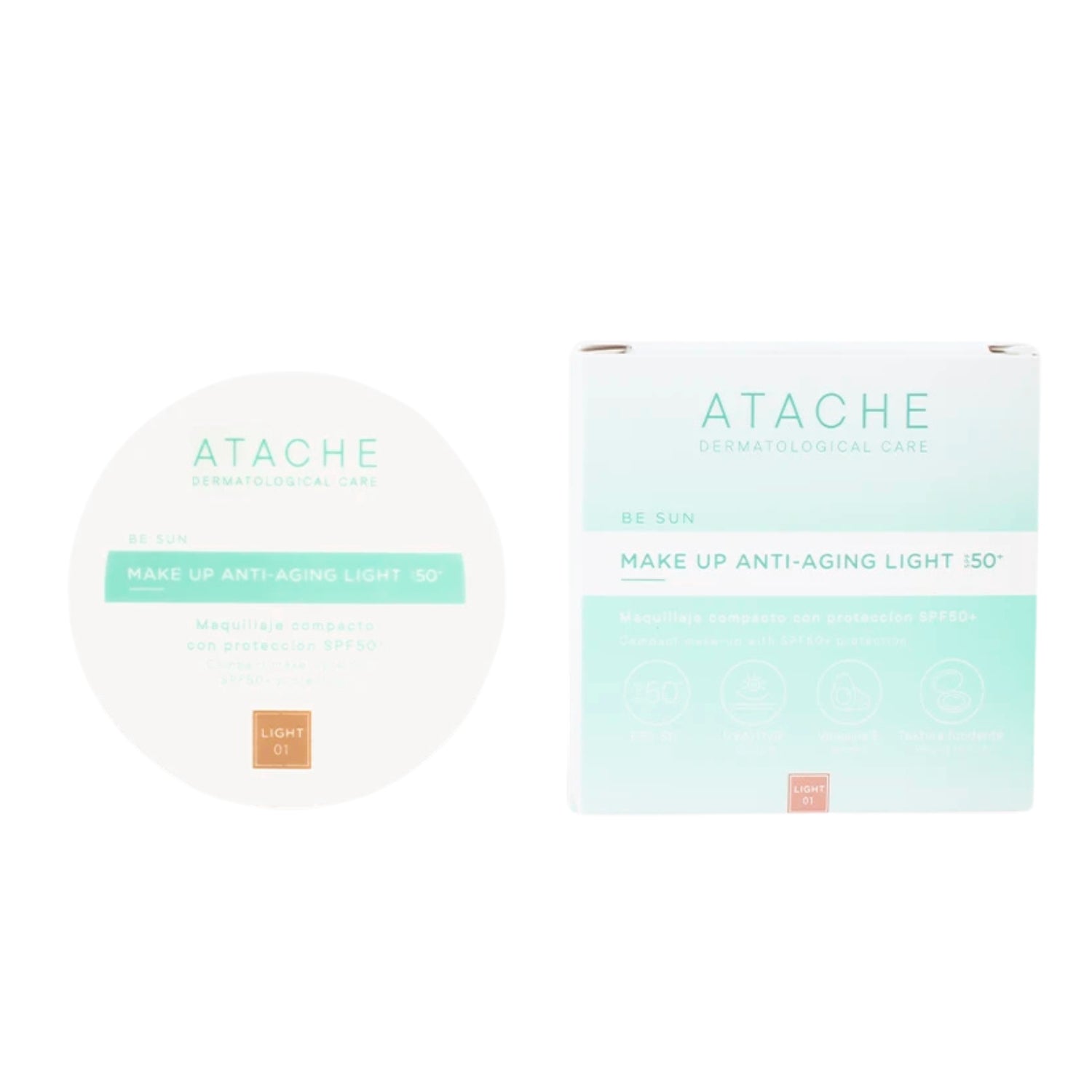 Maquillaje compacto SPF 50+, Atache Make Up Anti-Aging, protección solar con color, tono claro, cuidado antiedad, maquillaje resistente al agua.