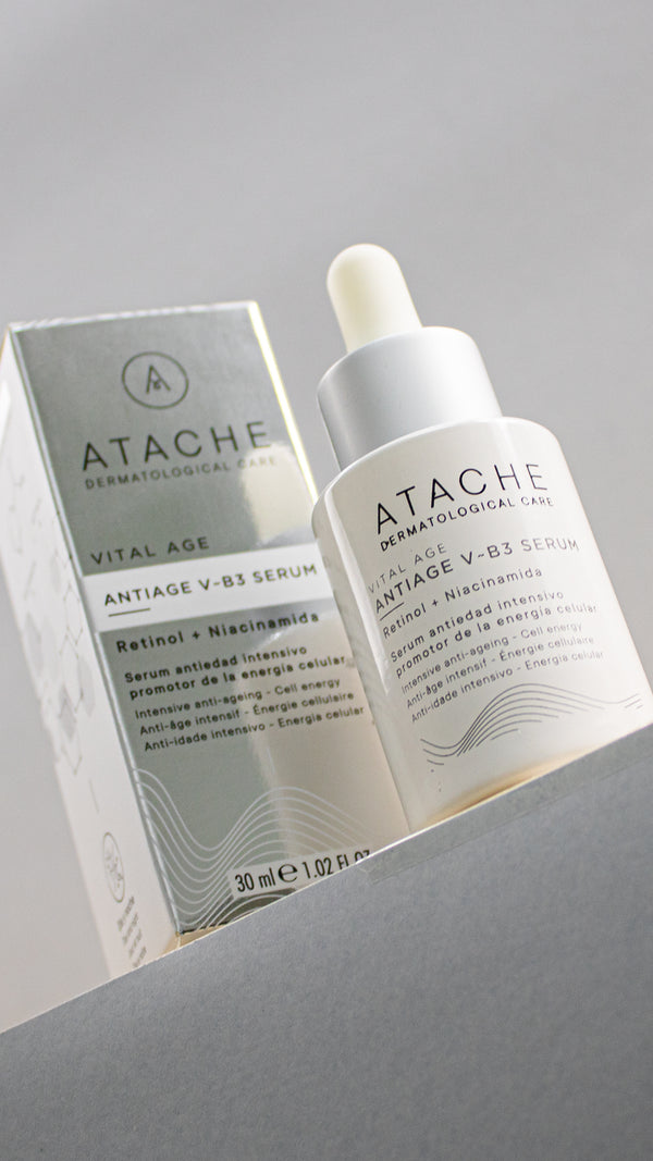 Sérum antiedad, Atache Vital Age V-B3, cuidado facial avanzado, vitamina B3, hidratación intensa, rejuvenecimiento de la piel.