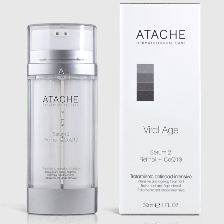 Revitaliza tu piel con Atache Vital Age Serum 2. Combina retinol y Coenzima Q10 para una acción antiedad y renovación celular avanzada.