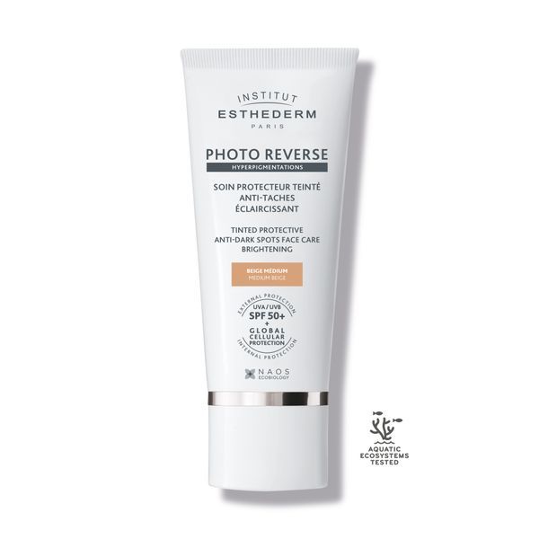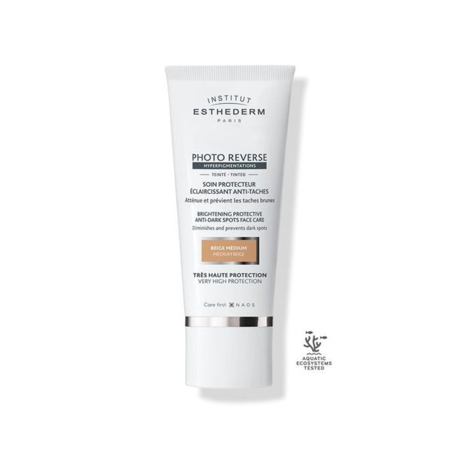 Las manchas oscuras o manchas de pigmentación suelen aparecer con la edad y también en casos de exposición prolongada y repetida al sol o la luz azul. La tez, hiperpigmentada y desigual, se vuelve opaca y pierde toda su luminosidad. Específicamente diseñado para pieles de tono medio a oscuro, el Cuidado Facial Protector Anti-manchas Oscuras y Aclarante PHOTO REVERSE en Beige Medio de Alta Protección unifica la tez y oculta, previene y corrige las manchas oscuras incluso en casos de exposición al sol o la luz azul. No comedogénico.