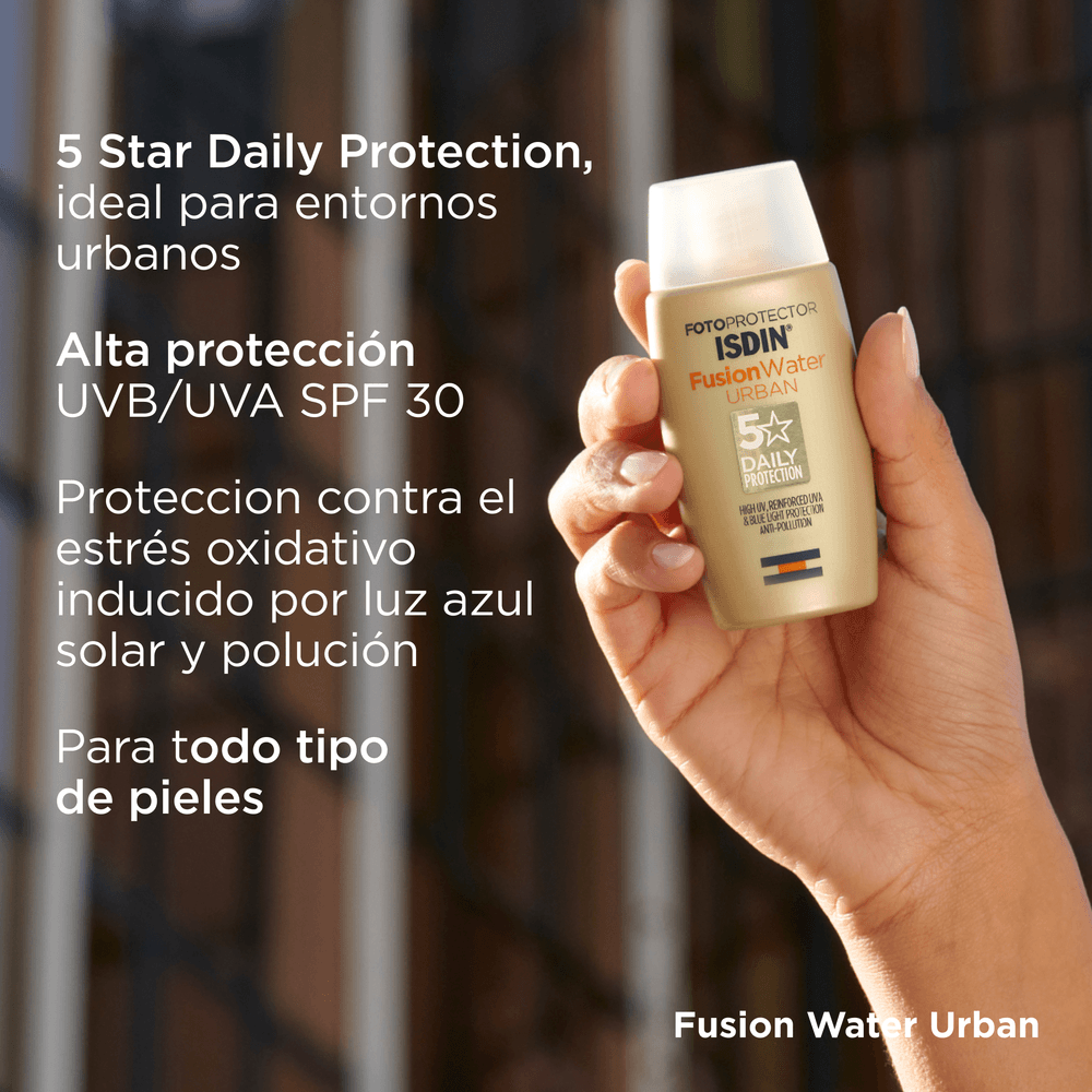 ISDIN Fotoprotector Fusion Water Urban SPF30 es un protector solar facial ideal para uso diario en entornos urbanos. Expuesta diariamente a la radiación solar y a los agresores ambientales en los estilos de vida urbanos, nuestra piel está constantemente bajo estrés oxidativo. No solo brinda una alta protección solar contra los rayos UVA / UVB y la luz visible, sino que también brinda beneficios antioxidantes que protegen la piel de los radicales libres, este protector solar es perfecto para la vida en la ciudad. No pica los ojos, no deja manchas blancas y se puede aplicar tanto sobre la piel seca como húmeda. De textura fluida, que se funde rápida y agradablemente con la piel, aporta luminosidad y un aspecto saludable a tu piel y proporciona una excelente base de maquillaje.