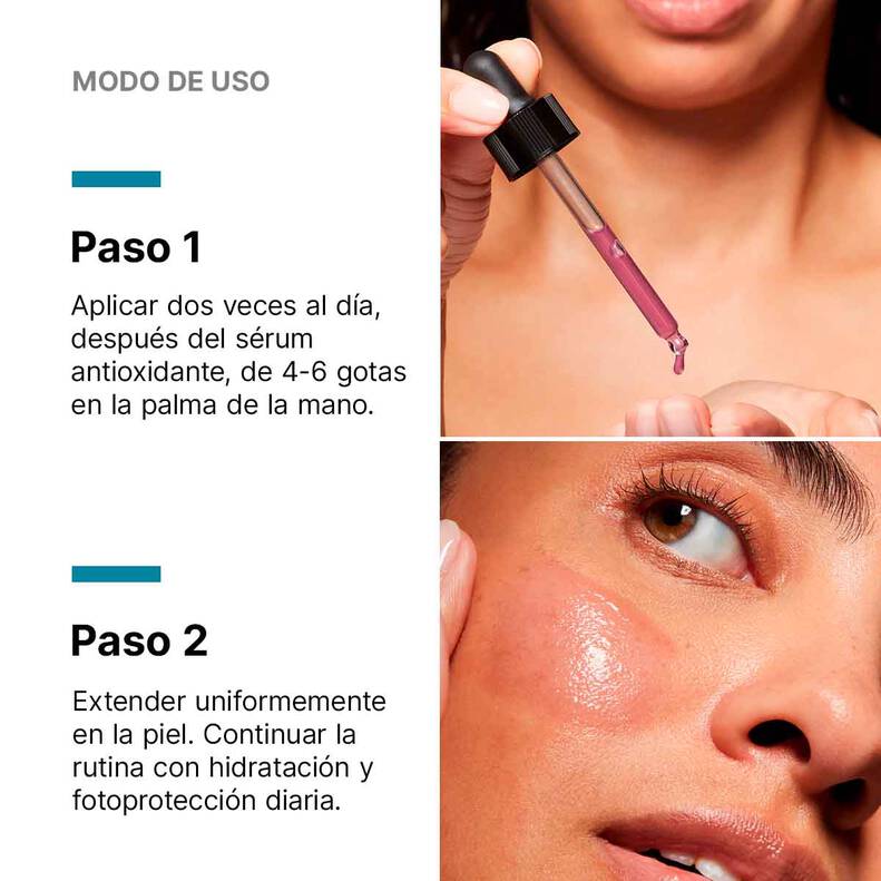 Aplica de 4 a 6 gotas sobre el rostro limpio, masajeando suavemente hasta su completa absorción. Úsalo por la mañana y noche, complementando con protector solar para maximizar resultados.