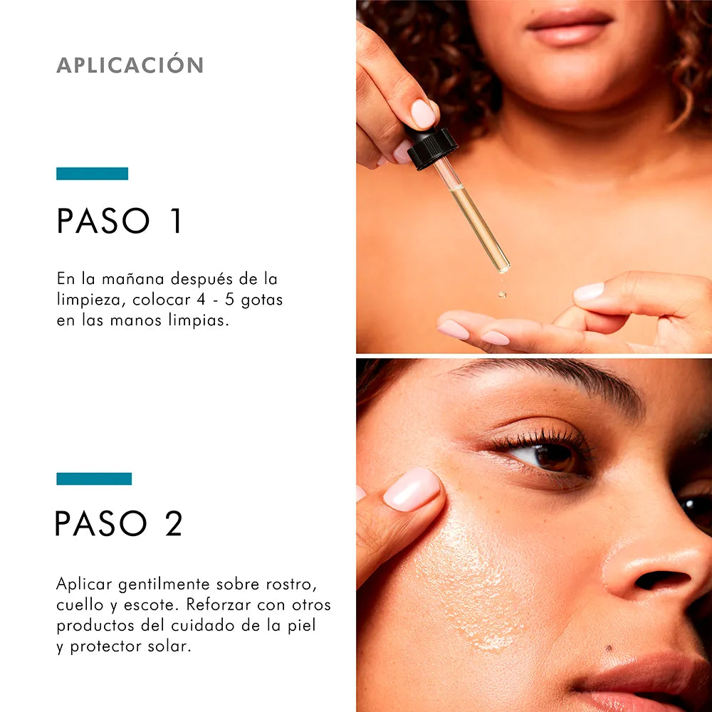 Modo de uso: Aplicar de 4 a 5 gotas sobre la piel limpia y seca del rostro, cuello y escote por la mañana, antes de otros productos de cuidado facial. Para mejores resultados, combinar con un protector solar de Skinceuticals.